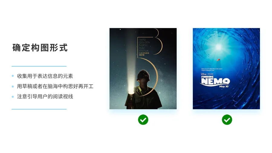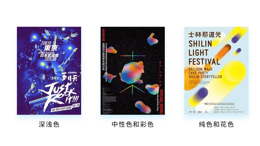 这里的深浅指的是黑白灰对比的重和轻,一般来说,色大而深显得比较重要,色小而浅显得比较次要,我们可以看一下前面讲构图那块展示的海报黑白版,会发现这个规律更加明显。