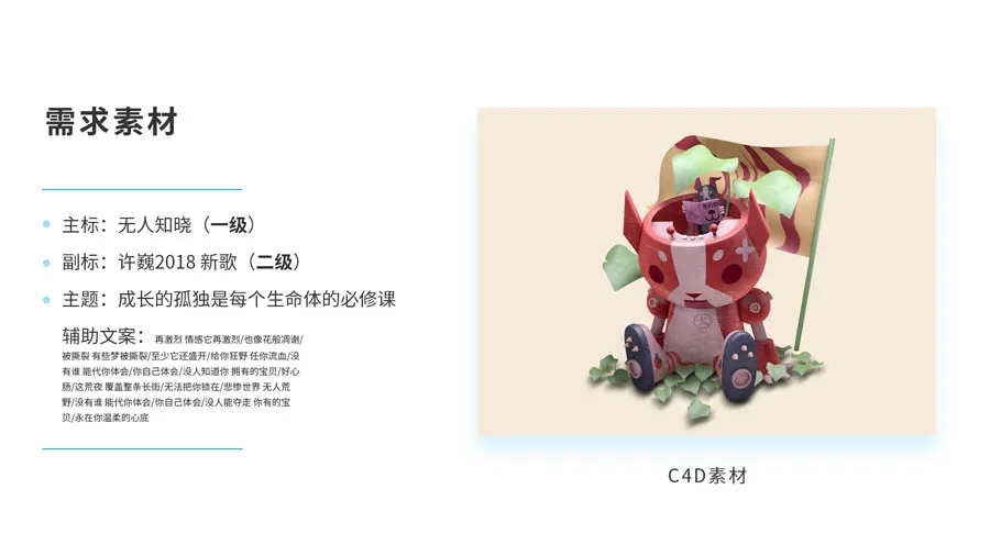 当我们的工作内容无法满足做文字比较多的平面海报的欲望时,可以考虑自命题的练习。当时听到许巍《无人知晓》这首新歌的时候,有一些感悟和想法然后做了一些C4d素材,想利用它作为主体和歌名做一下排版练习: