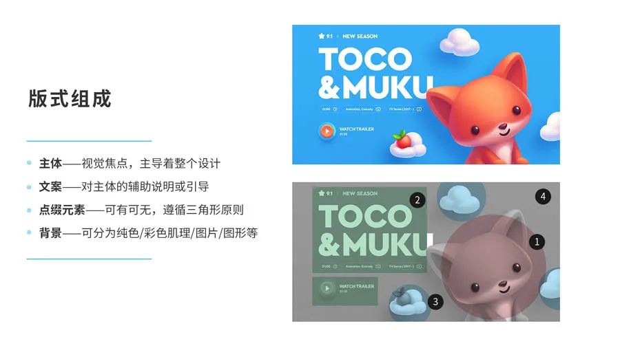 主体和文案组合的形式可以是圆形,三角形,矩形等形状构图。注意如果是用三角形构图,最好呈倒金字塔结构,这样更加轻便引导用户进入下一个信息层。