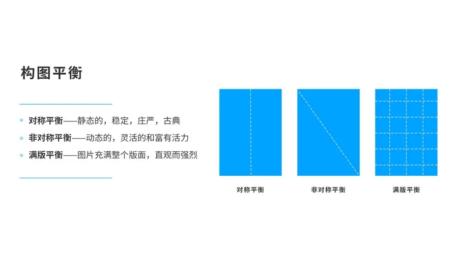 在设计中,平衡是实现统一的一条重要途径。如果上面所说的元素组合起来处于平衡状态,那么这个设计看起来就是统一的,就会给人一种整体印象。因此,平衡是视觉传达设计的一个重要方面。版式平衡总共有3种分类,分别是:对称平衡,非对称平衡和整体平衡。