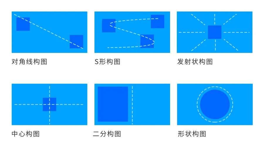 非对称在不对等的元素间创设出秩序和平衡,非对称设计由于版式不可预见,所以空间是变化的。特点是动态的,灵活的和富有活力。非对称构图比较多,常见的有以下6种形式。