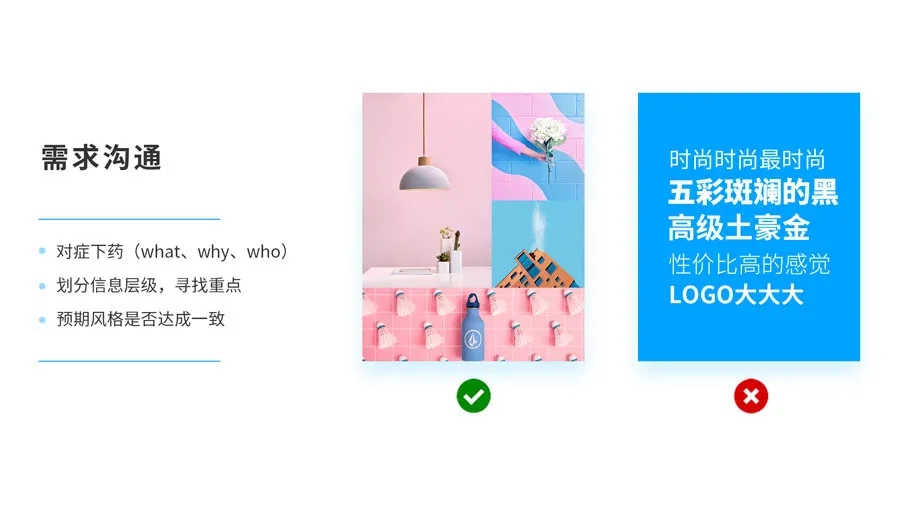 Ps:关于第3步风格沟通,建议双方用图片交流和表达。毕竟每个人对“高大上”的理解都是不一样的,有的人认为是五彩斑斓的黑,有人认为是大量的留白。