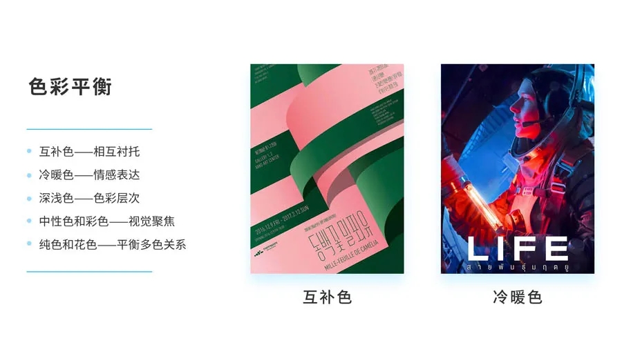 互补色就是色环上相对的两个颜色,海报中的绿色和红色就是这种关系,相互映衬,相互衬托,从而达到了一种平衡。