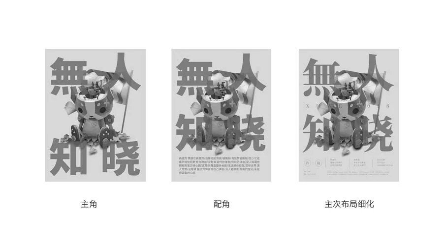 在开始动手做之前我就想好了这次想做一个视觉直观而强烈的海报,再加上主体是文案和素材的结合,所以我才采用了满版构图。在黑白灰中将主角和配角的位置确定好,再去调整字体和距离。